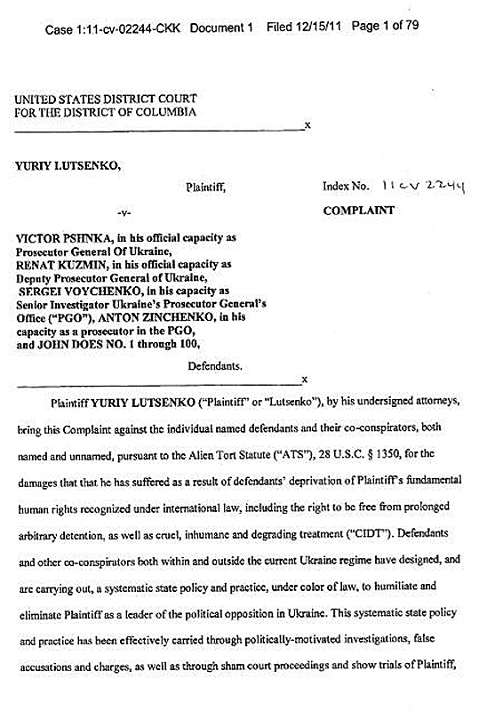 Текст иска Юрия Луценко в Федеральный суд округа Колумбия против Генпрокурора Украины Виктора Пшонки, первого заместителя Генпрокурора Рената Кузьмина, старшего следователя Генпрокуратуры Сергея Войченко и прокурора Генпрокуратуры Антона Зинченко.