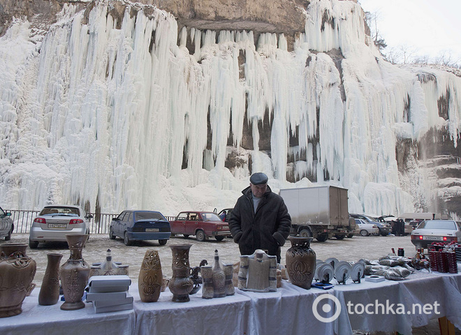 Сейчас уличные торговцы ручной вязки продают перед замерзшим водопадом шерстяные носки. Торговцы ждут при тока клиентов из-за больших морозов.