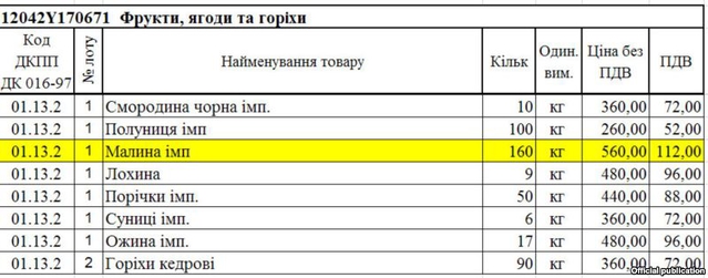 Но рекорд госзакупок побила малина по 672 грн. за килограмм. На десерт депутатам и работникам АП также купили чернику и ежевику по 576 грн/кг, манго по 408 грн/кг, черную смородину по 432 грн/кг и кедровые орешки по такой же цене.