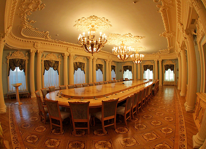 Конференц-зала Верховного Суду дуже затишна. Стіни прикрашені гіпсовою ліпниною у вигляді голубів - символів миру, снопів - символів щедрості, а також картушами омега - це архітектура,яка посміхається.